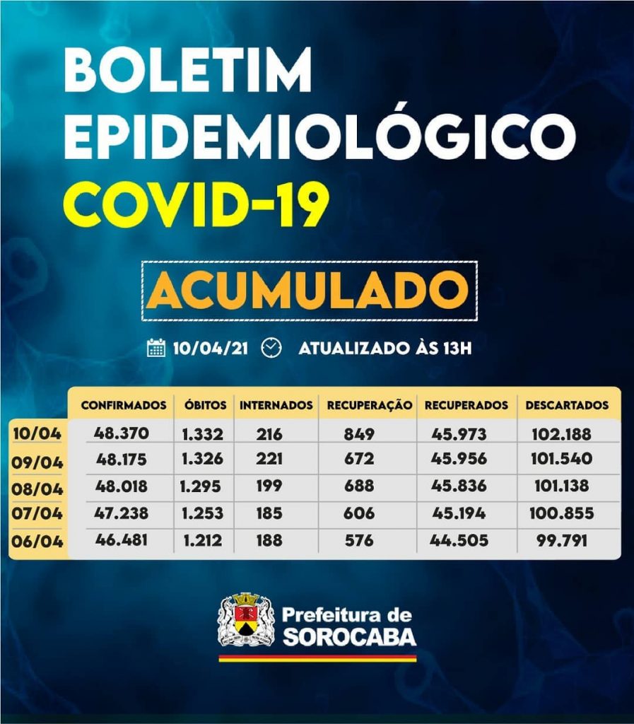 A Prefeitura de Sorocaba, por meio da Secretaria da Saúde (SES), registrou aumento do número de recuperados da Covid-19 neste sábado (10), chegando ao total de 45.973. Já, os casos confirmados com a doença passaram de 48.175 para 48.370 na cidade. Os óbitos com a confirmação da doença subiram para 1.332 e a taxa de […]