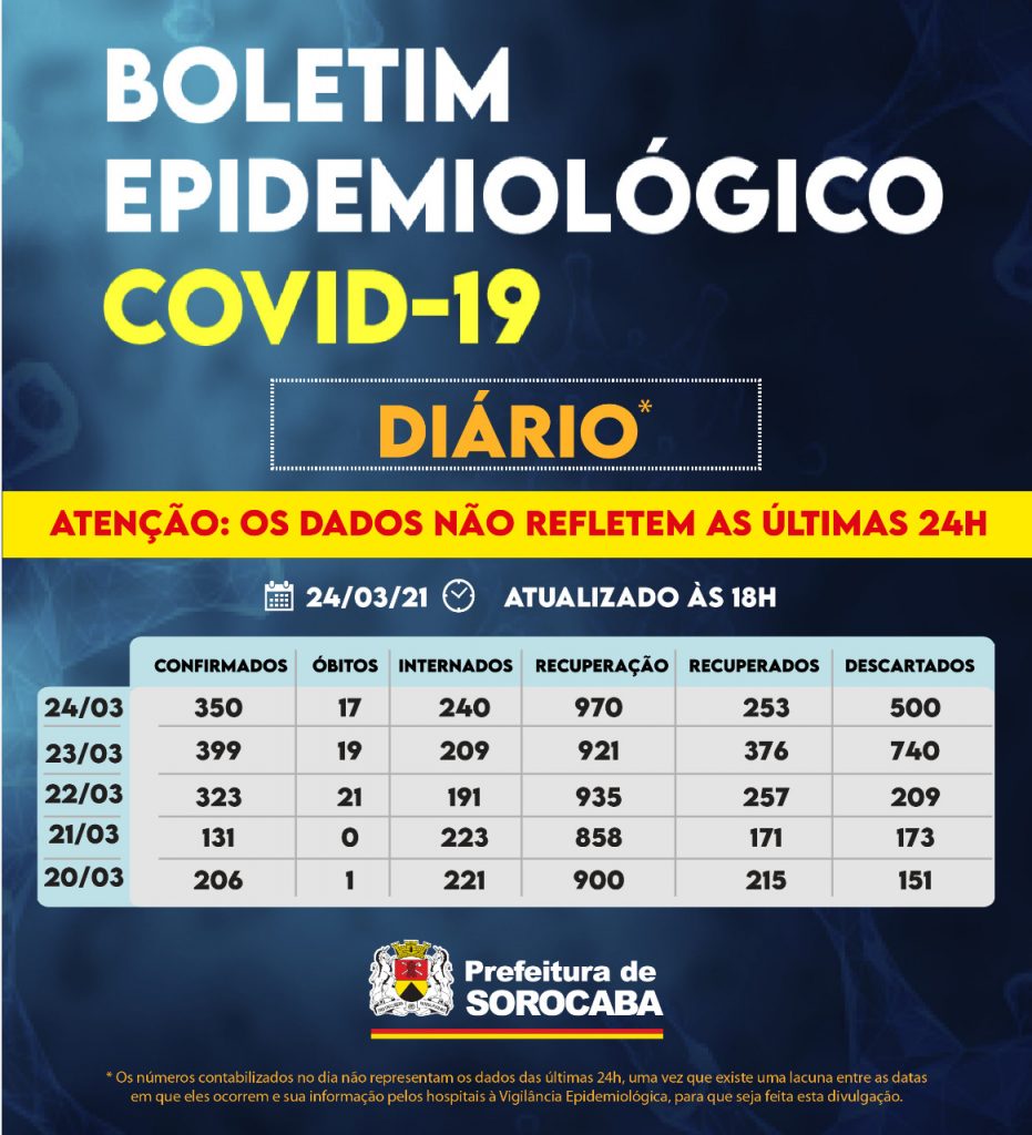 A Prefeitura de Sorocaba registrou aumento do número de recuperados da Covid-19 nesta quarta-feira (24), chegando ao total de 38.553. Já, os casos confirmados com a doença passaram de 40.375 para 40.725 na cidade. São 962 óbitos desde o início da pandemia. A taxa de letalidade no município é de 2,3%, abaixo da taxa estadual, […]