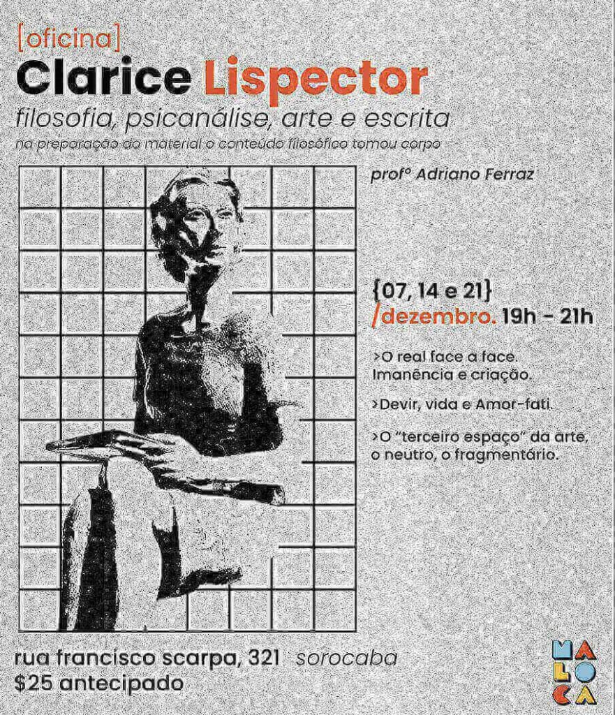 Para quem deseja conhecer, se aprofundar e exercitar a produção escrita, a Maloca Centro Cultural está com inscrições abertas para a oficina “Clarice Lispector: filosofia, psicanálise, arte e escrita”, que acontecerá nos dia 07, 14 e 21 de dezembro, das 19h às 21h, com o Professor Mestre Adriano Ferraz. A taxa de matrícula é de […]
