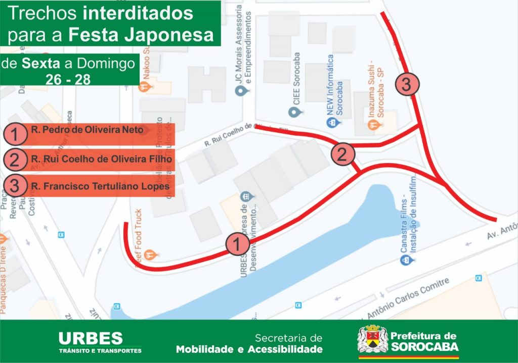 A Urbes – Trânsito e Transportes informa que a partir de sexta-feira (26) são interditados trechos de três ruas no jardim Panorama, na região do Campolim. A intervenção é necessária para a promoção da Festa da Colônia Japonesa, que será aberta ao público gratuitamente e promovida no final de semana, na praça Kasato Maru. A […]