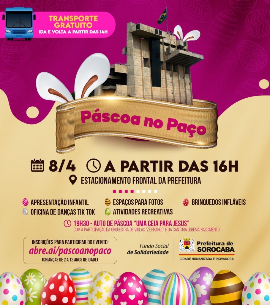 No próximo sábado, dia 8 de abril, a partir das 16h, acontece a celebração da Páscoa, no estacionamento frontal do Paço Municipal, no Alto da Boa Vista, com entrada gratuita e aberta a todos. O evento é Organizado pela Prefeitura de Sorocaba, por meio do Fundo Social de Solidariedade (FSS), com apoio das Secretarias de […]